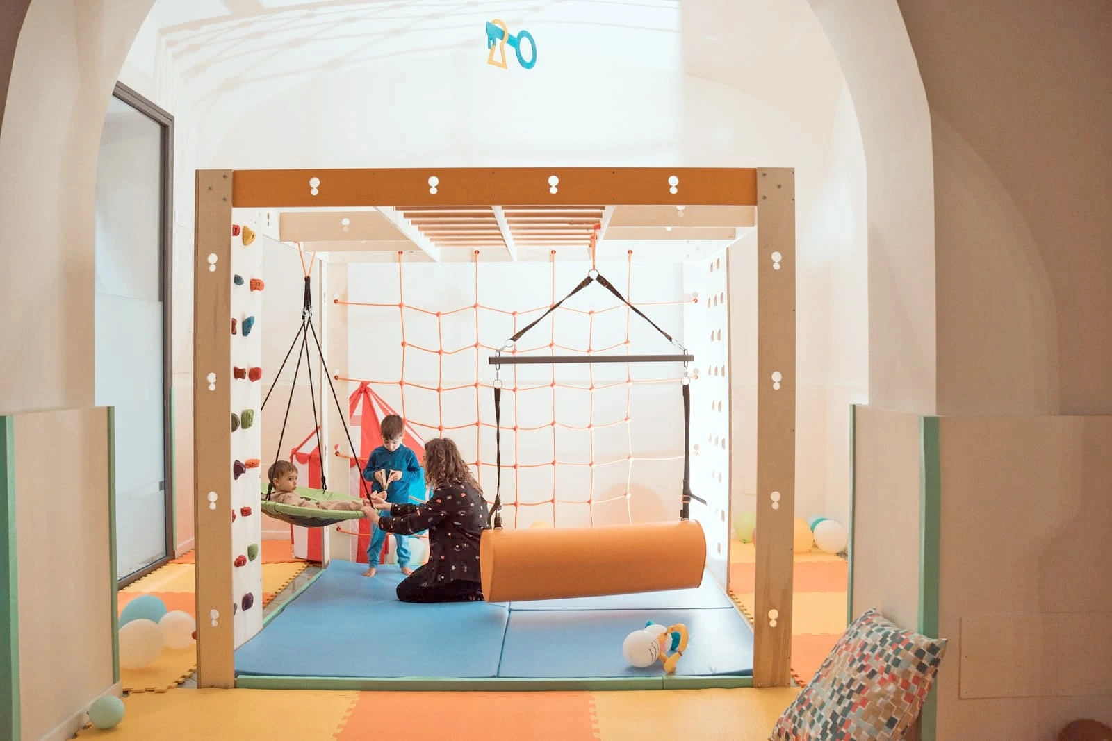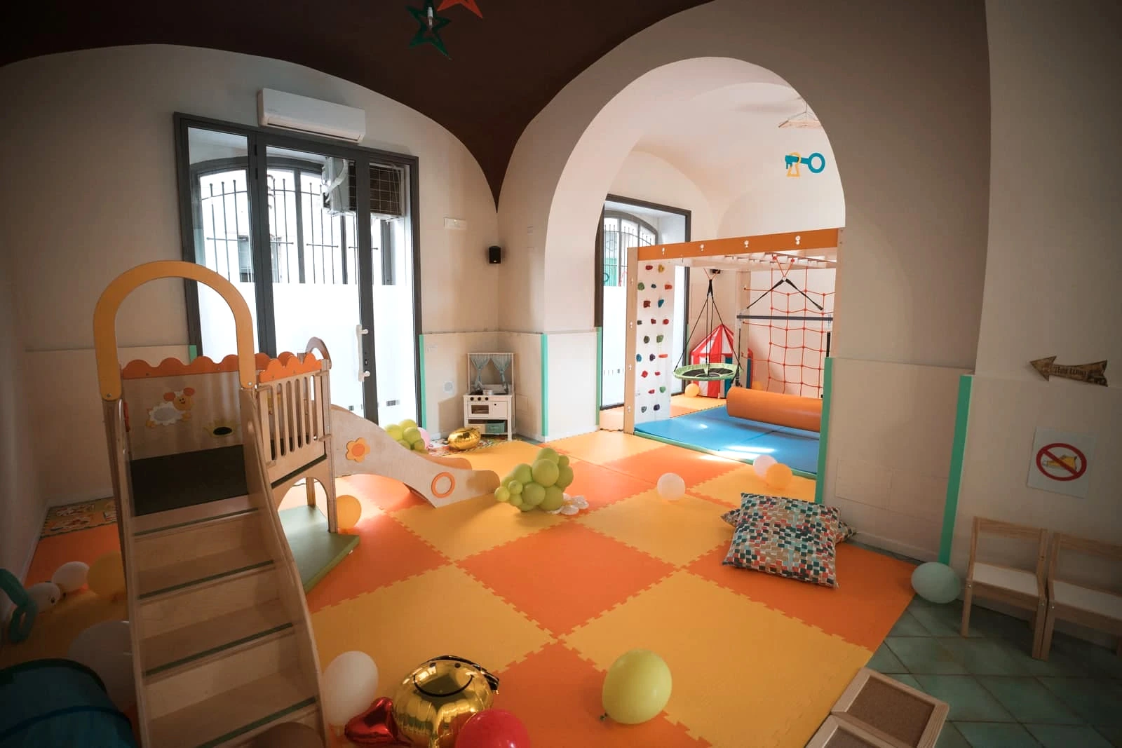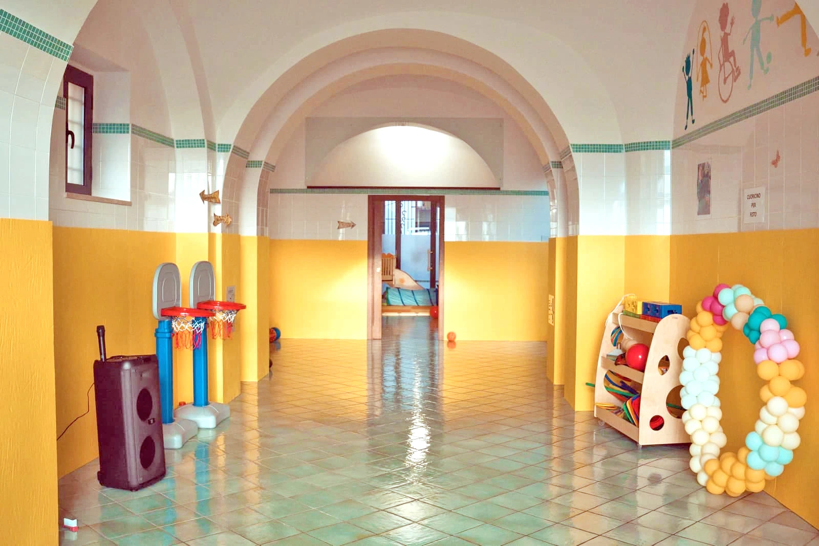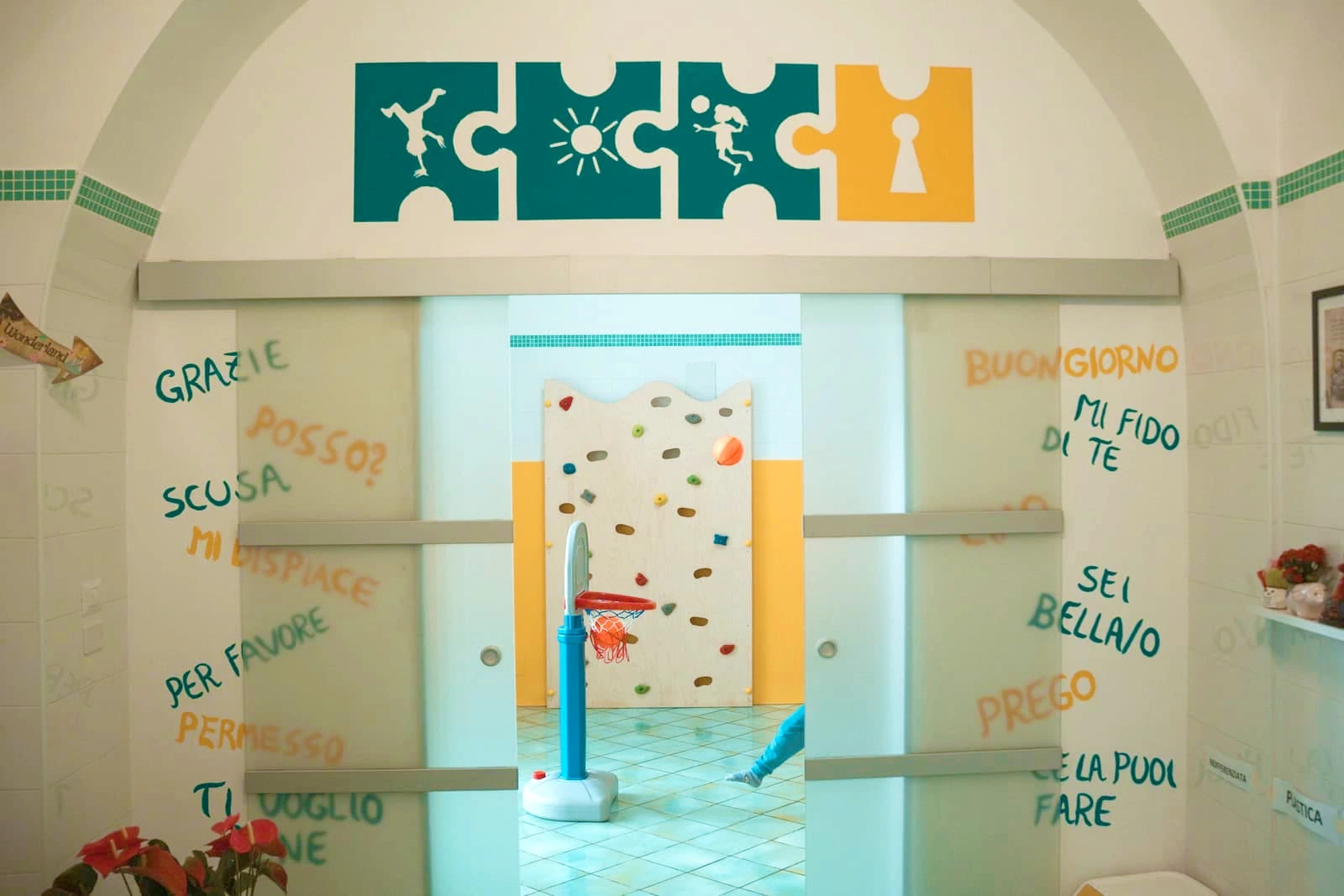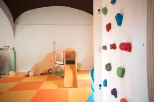 L’area motoria in cui si svolgono i vari laboratori sul movimento e il gioco sport. L’area ludica, divisa in una zona con tappetoni e giochi di legno, come scivolo, arrampicata, dondolo e una zona con tavoli dove si svolgono i nostri laboratori manuali. Vi è poi, un’area riservata ai servizi igienici e allo spogliatoio, dove i tuoi figli potranno cambiarsi e poggiare le loro cose.